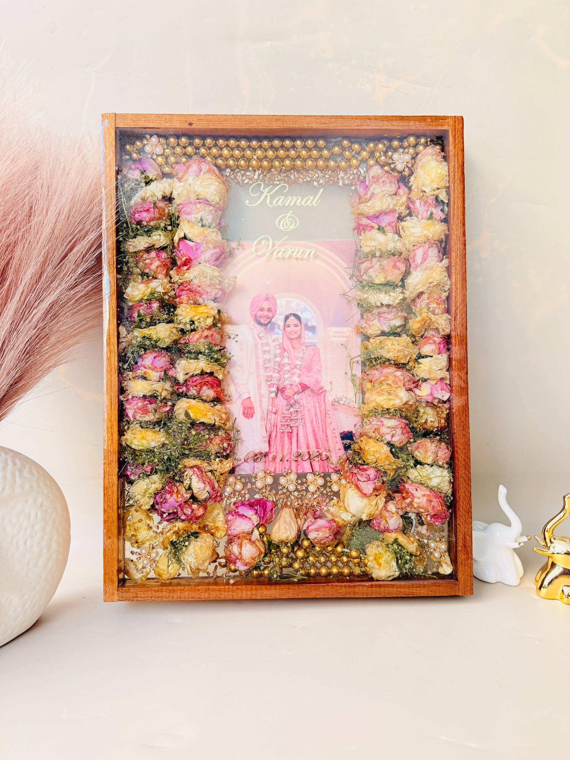 This is one of our most loved creations — designed to beautifully preserve your full wedding garlands and turn them into a timeless keepsake of your special day.